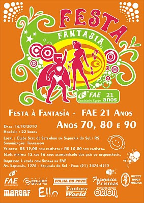 Hey galera, dia 06/11 rolará uma festa à fantasia no Capão da Cruz, os ingressos custam apenas R$10,00, para mais informações ligue: 81639370 ou 97650301, falar com Anderson ou Taís.